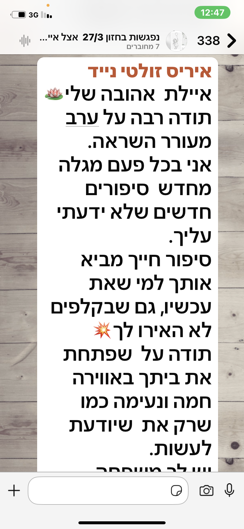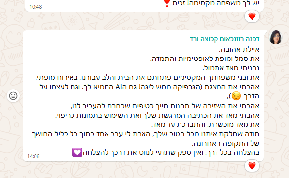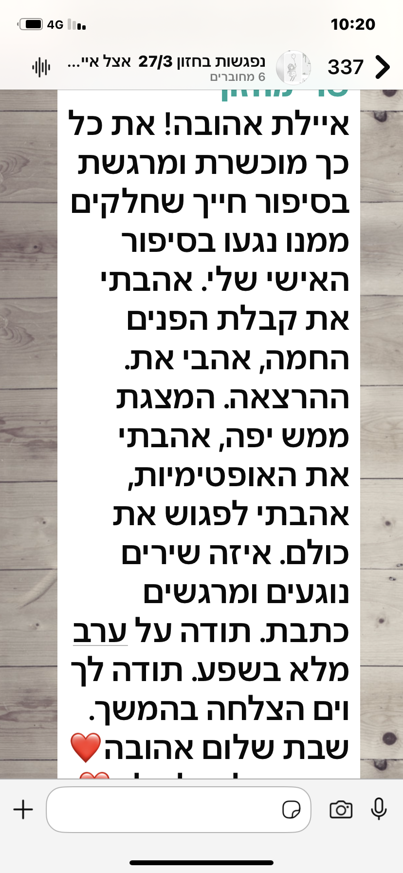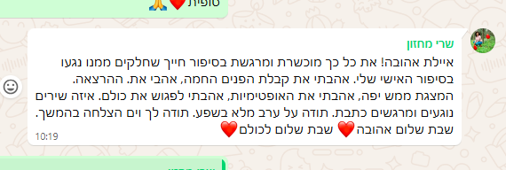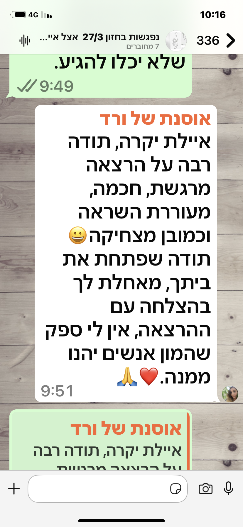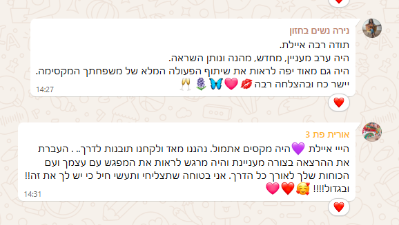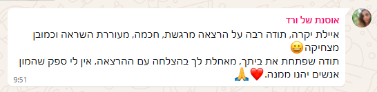 ברור לי שכל אחת מאיתנו תיקח איתה את הטיפים ותשתמש בזה להעצמה וכח מתוך המשוב שיקיבלתי מהמשתתפות למדתי שהמשתתפות מבקשות לחזור שוב ושוב ולקבל ממך עוד ועוד כוחות ( וזו לא הפעם הראשונה).