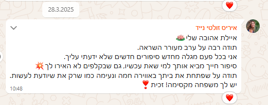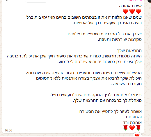 תודה לך על ששיתפת אותנו בחוכמתך, בתובנותיך ובסיפור חייך המעורר השראה. יצאתי מההרצאה בתחושה של העצמה ועם כלים חשובים להתמודדות עם אתגרי החיים, ובמיוחד עם תובנה חשובה עבור תלמידיי.